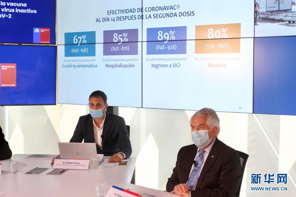 4月16日,智利衛(wèi)生部長帕里斯(右)與智利衛(wèi)生部顧問阿勞斯在圣地亞哥出席發(fā)布會,公布中國科興新冠疫苗保護效果在該國的真實世界研究結(jié)果。新華社發(fā)(智利衛(wèi)生部供圖)