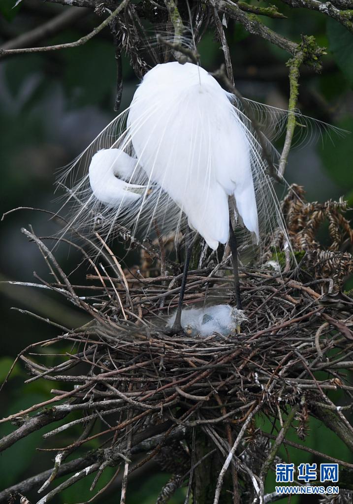 在南昌市新建區(qū)象山森林公園內(nèi),白鷺守護(hù)著雛鳥(5月18日攝)。