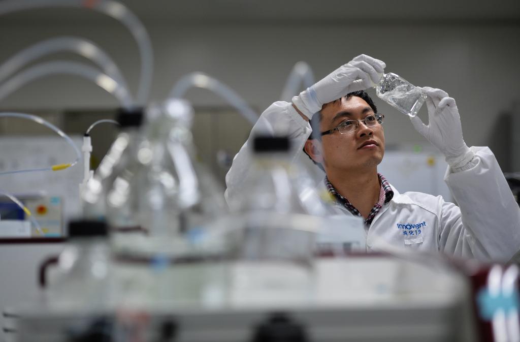 2017年5月9日,江蘇蘇州,在信達生物制藥(蘇州)有限公司研發實驗室,一名工程師在觀察藥物中間產品外觀。 新華社記者 李響 攝