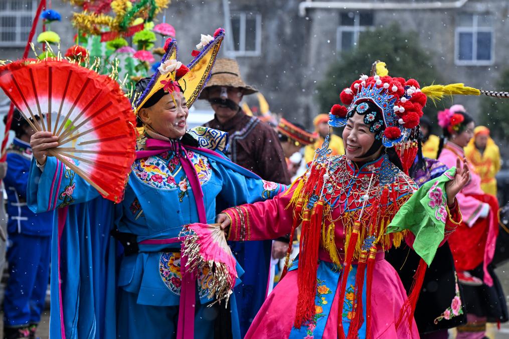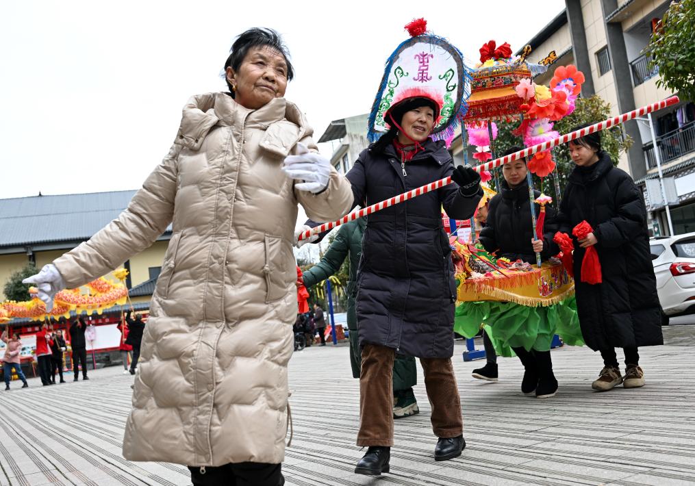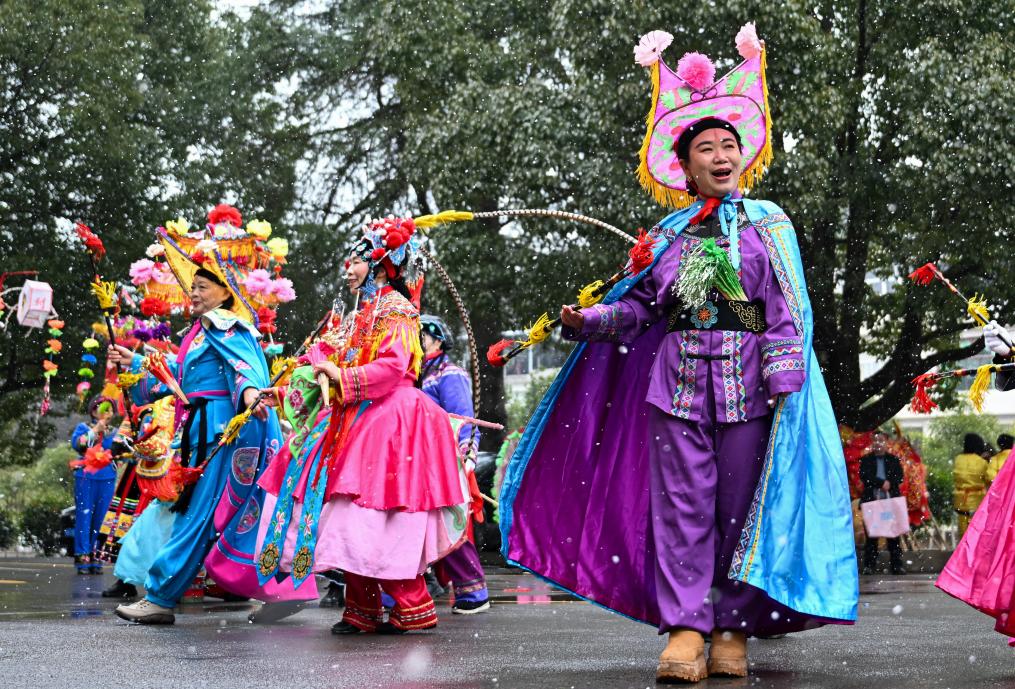 2月6日,在湖北省恩施州利川市柏杨坝镇,灯歌队在表演灯歌。 以《龙船调》为代表的利川灯歌歌曲,其内容主要围绕生活、劳动展开,表达了人们对美好生活的向往和追求。2011年,利川灯歌入选第三批国家级非物质文化遗产名录。