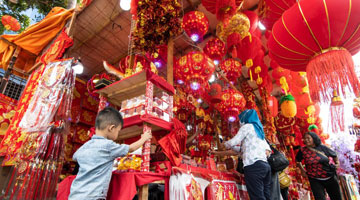 1月9日,一名头戴“巴珠”(藏式头饰)的女孩陪着家人置办年货。