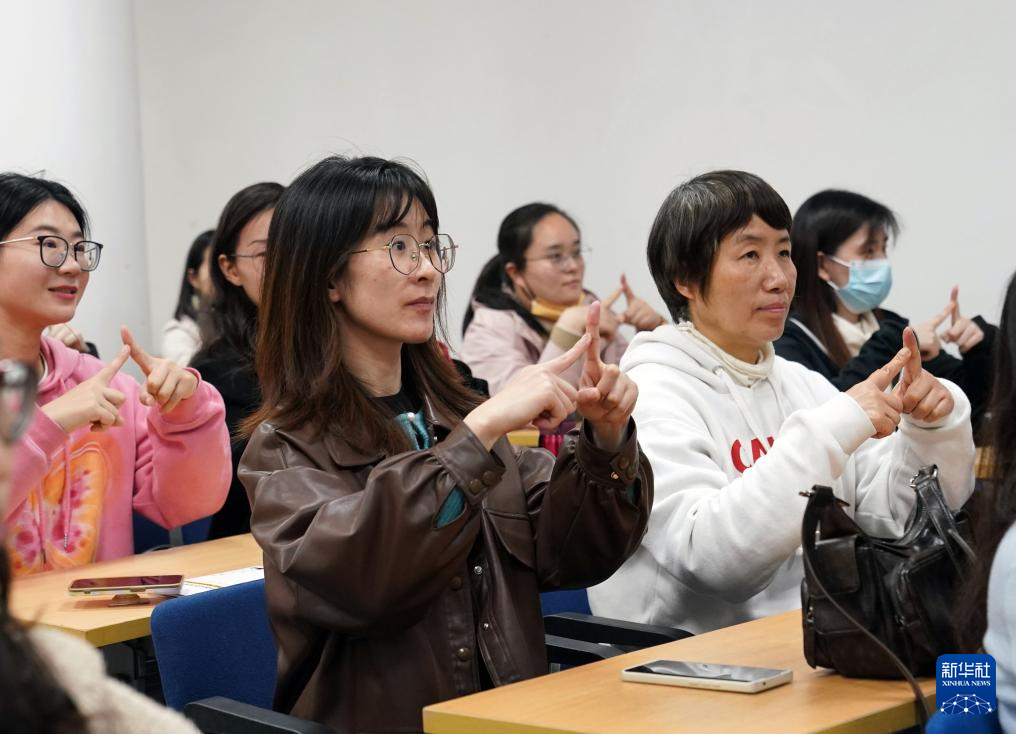 4月8日晚,在上海市群众艺术馆,夜校学员们在学习手语课程。