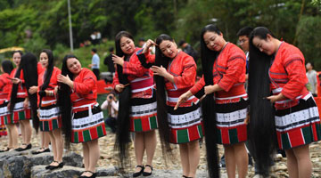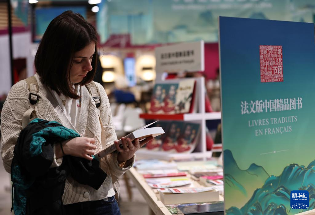 4月12日,人们在法国巴黎临时大皇宫举行的2024巴黎书展上翻阅中国图书。