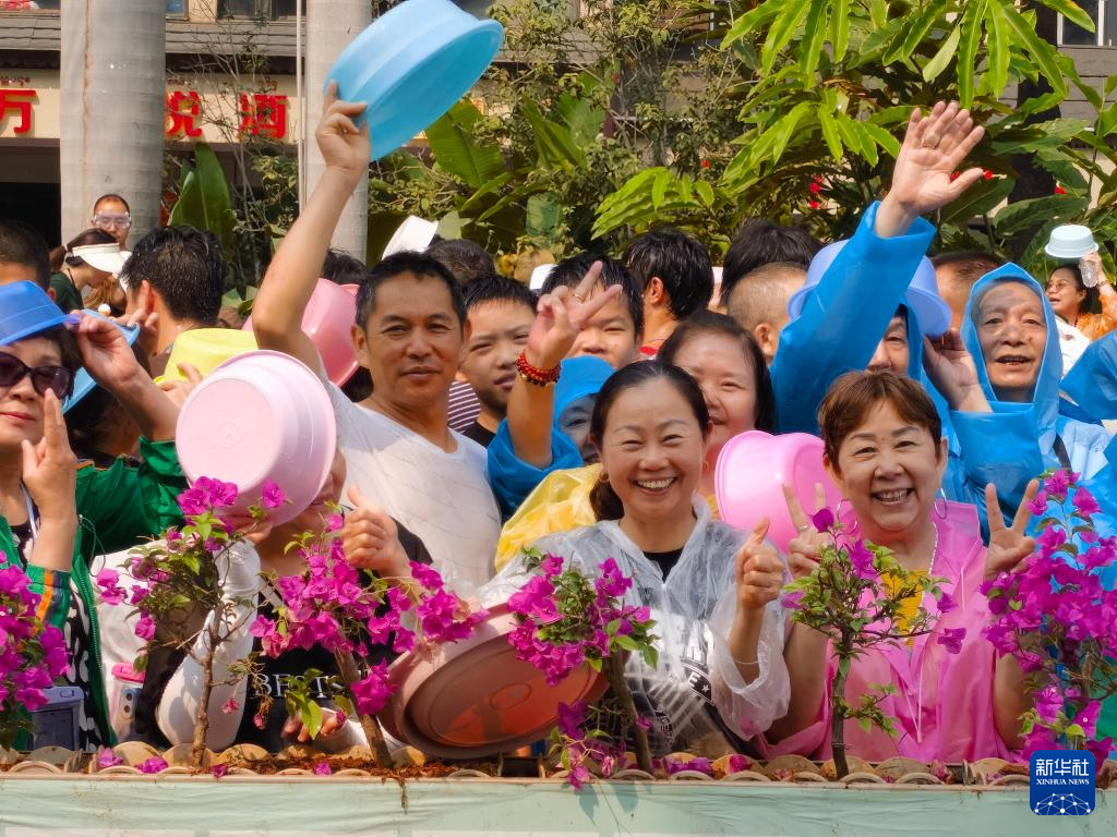 当日,云南省西双版纳傣族自治州举行泼水狂欢活动,人们欢聚在景洪市泼水广场,用相互泼水的方式互送祝福,庆祝泼水节。