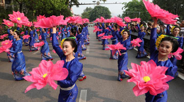 4月14日,在福州茉莉花文化体验馆,福州外国语学校与姊妹校巴黎斯坦尼斯学校的师生合影留念。
