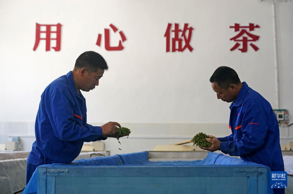 江西省修水县漫江乡的宁红茶制茶基地,俞旦华查看鲜叶的揉捻情况(3月29日摄)。