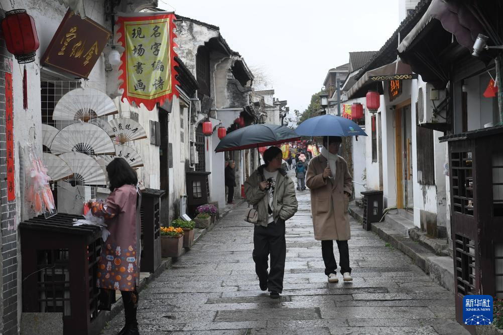 2月20日,人们在雨中的仓桥直街游玩。