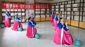 来自青海玉树藏族自治州的农牧民演员在表演《高原踏舞》(5月13日摄)。