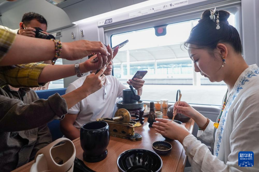 5月20日,南京客运段工作人员(右一)在G2807次高铁列车车厢内进行茶艺表演。