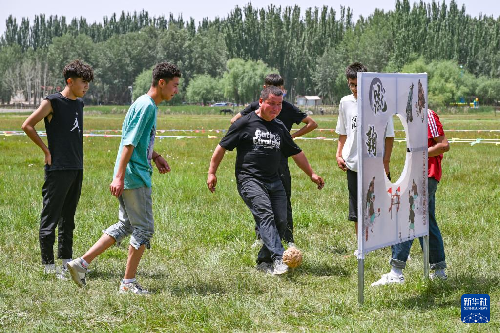 6月10日,在新疆阿克苏地区拜城县康其湿地公园,群众体验传统蹴鞠。