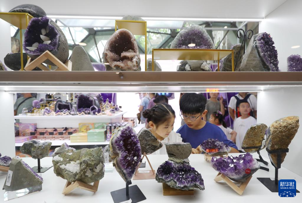 7月16日,参观者在一组产自巴西的玛瑙外壳紫水晶球体展品前驻足观看。
