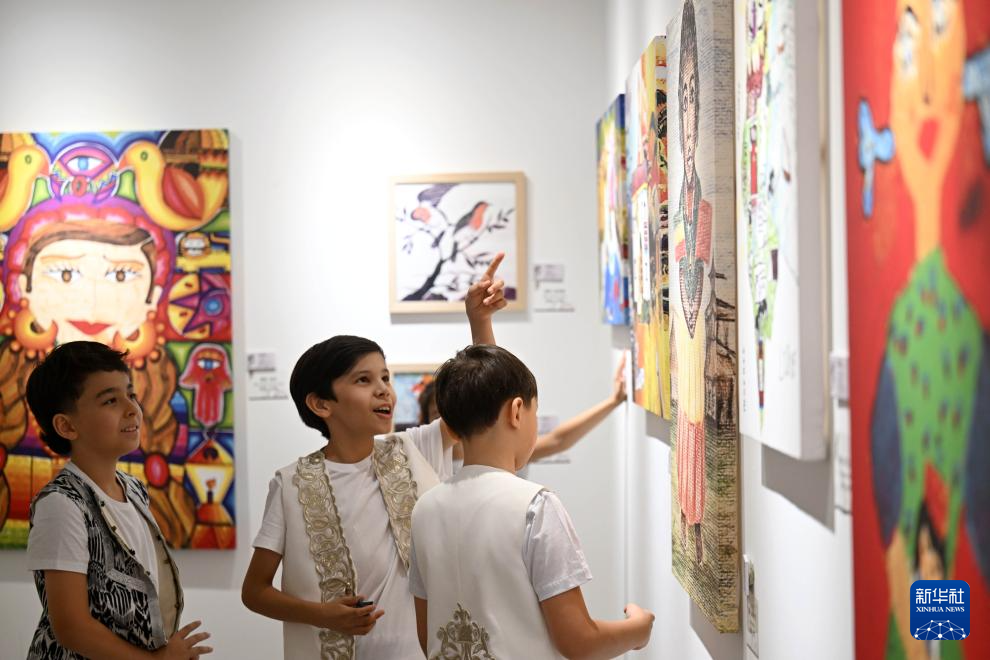 7月22日,乌兹别克斯坦托马斯儿童音乐剧团成员在参观艺术节期间举办的世界儿童绘画展览。