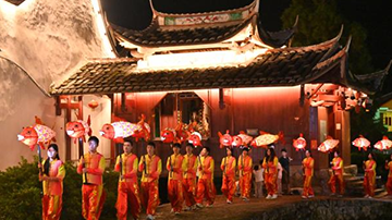 8月18日,在柳州市融水苗族自治县汪洞乡,村民们在改造后的河道上进行文艺表演。