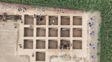 7月17日,在甘肃省敦煌市玉门关遗址区,牛群在大方盘城附近觅食(无人机照片)。