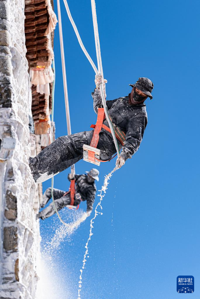10月30日,布达拉宫管理处的工作人员在喷洒涂料。