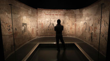 麦积山石窟艺术研究所保护研究室文物修复师牟常有在麦积山石窟133窟内查看塑像(11月2日摄)。