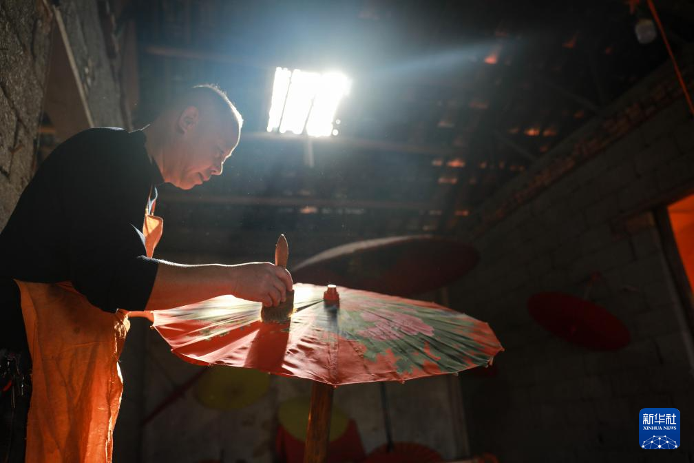 11月13日,在泾县昌桥乡孤峰村国民油布伞厂,省级非物质文化遗产传承人郑国民在检查伞面。