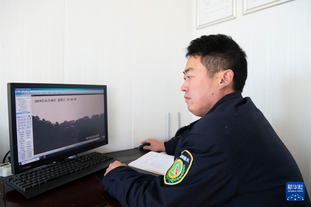12月18日,黄山风景区管委会园林局瞭望哨防火小队队长秦志平在平天矼瞭望哨内查看森林防火视频监控。