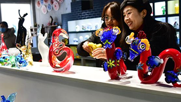 1月9日,消费者在淄博市博山区西冶工坊展销厅内挑选蛇年主题琉璃工艺品。