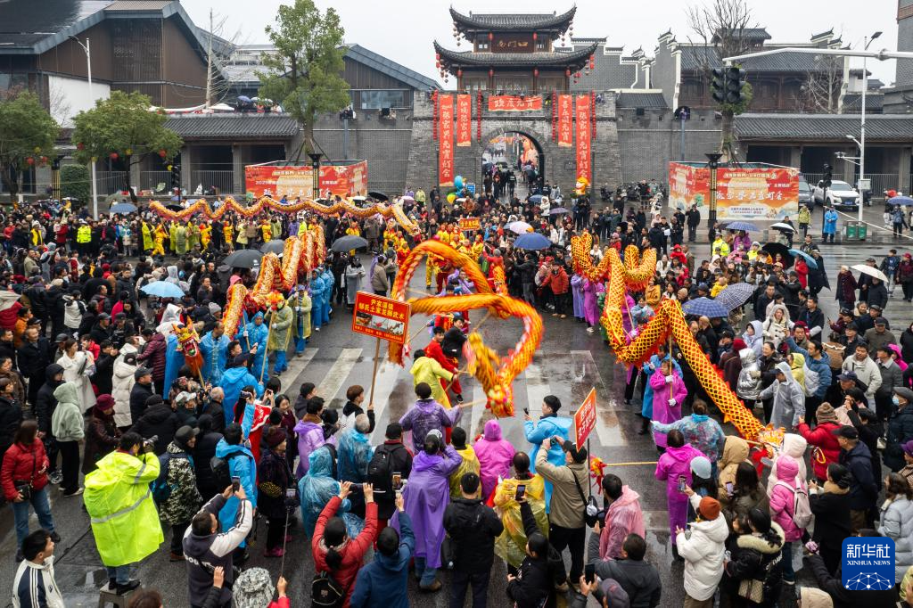 2月12日,外国留学生在张家界市永定区参与舞龙表演。
