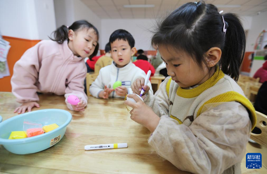 3月20日,甘肃省定西市安定区实验幼儿园的小朋友在绘彩蛋。