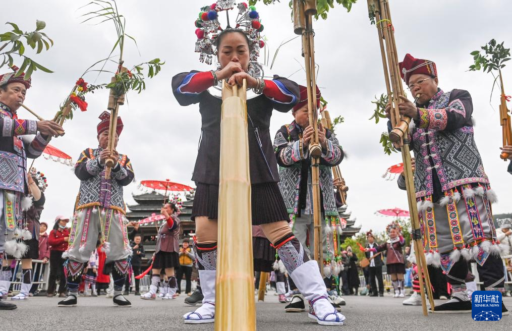 3月31日,在广西三江侗族自治县古宜镇举行的“三月三”庆祝活动上,侗族群众吹奏芦笙。