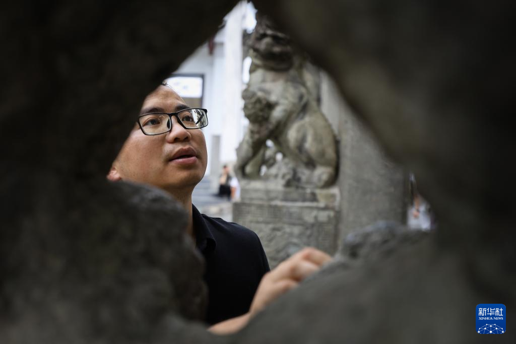 6月19日,周虎在位于歙县的全国重点文物保护单位棠樾牌坊群巡查。