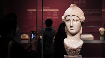 7月7日,一名小朋友在江西南昌滕王阁内的《滕王阁序》铜碑前驻足。