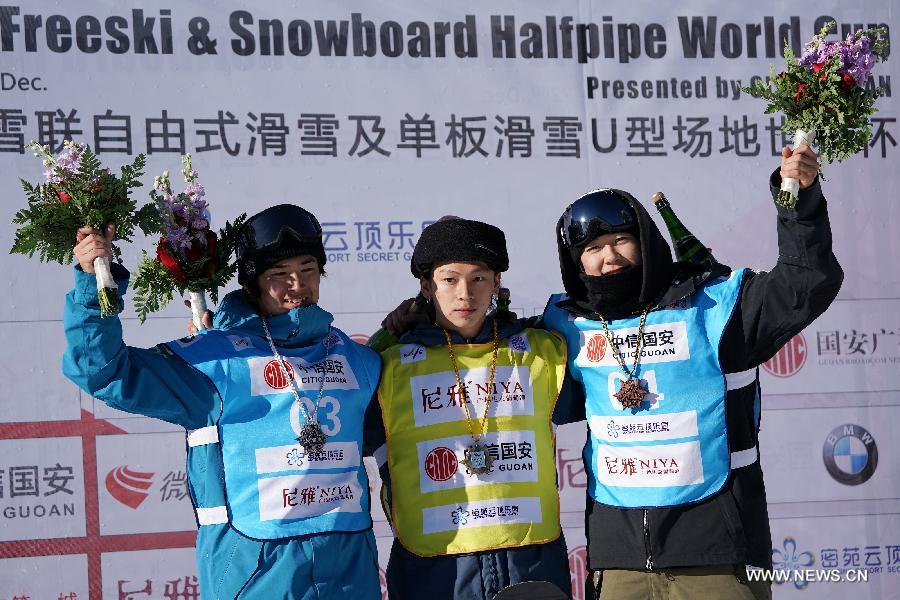 Winner Japan's Hirano Ayumu (C), runner-up Japan's Katayama Raibu (L) and the third-place-winner Japan's Totsuka Yuto celebrate after the men's competition of 2017-2018 FIS Snowboard Halfpipe World Cup held at Genting Resort Secret Garden in Chongli District of Zhangjiakou City, north China's Hebei Province, Dec. 21, 2017. (Xinhua/JuHuanzong)