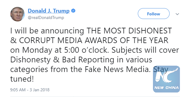 WASHINGTON, Jan. 2 (Xinhua) -- U.S. President Donald Trump said late Tuesday he would present "the Most Dishonest and Corrupt Media Awards" of the year 2017 on Monday.