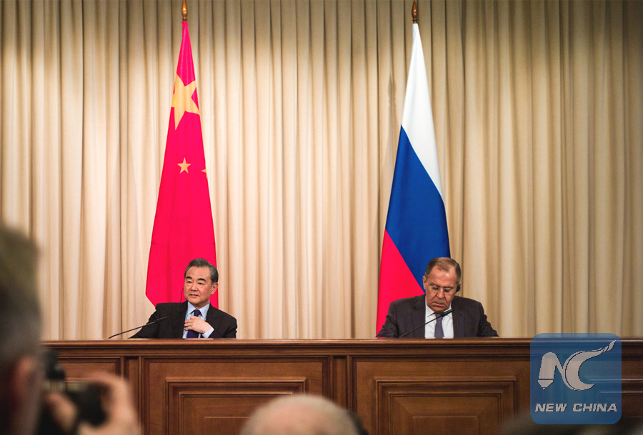 Chinese President Xi Jinping's special envoy, State Councilor and Foreign Minister Wang Yi (L) and Russian Foreign Minister Sergei Lavrov attend a press conference after their talks in Moscow, Russia, on April 5, 2018. (Xinhua/Wu Zhuang)