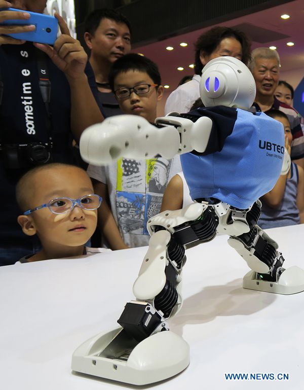 Visitors watch a robot dance at the World Robot Conference 2017 in Beijing, capital of China, Aug. 25, 2017. Over 300 artificial intelligent (AI) specialists and representatives of over 150 robot enterprises attended the conference. (Xinhua/Li Mingfang)