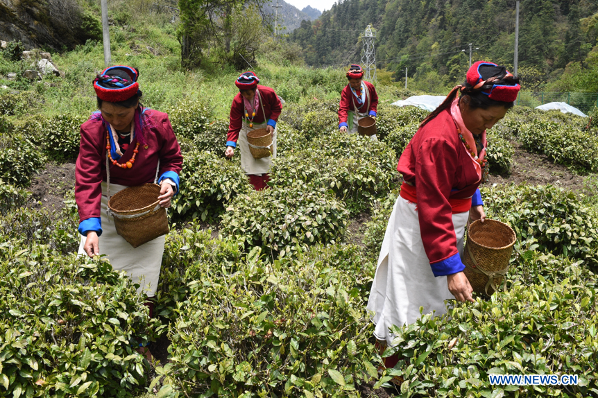 Members of tea farmers and herdsmen professional cooperative pick tea leaves in a tea garden in Le Menba Ethnic Township of Cuona County in Shannan, southwest China's Tibet Autonomous Region, May 12, 2018. The tea cooperative was founded in 2011. In 2017, the income per capita of the township increased by about 12,000 yuan under the cooperative. Tea industry has now become one of the most important driving forces of local economy. (Xinhuanet/Chen Lin)