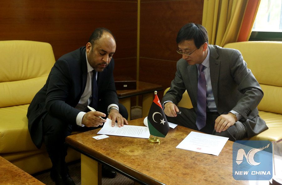 The signing of the documents took place at the headquarters of the Libyan Ministry of Health in the capital Tripoli, after a meeting between the Chinese Charge d'Affaires in Libya Wang Qimin and the Libyan UN-backed government's Health Minister Omar al-Tahir Bashir.