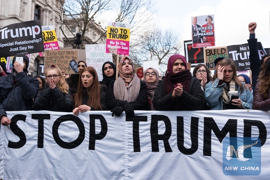 File Photo: Thousands of demonstrators protest against Donald Trump travel ban on Muslim's travelling to the United States in central London on Feb. 4, 2017. (Xinhua/Ray Tang)