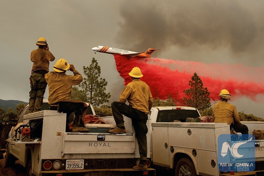 Firefighters watch as an air tanker drops retardant while battling the Ferguson fire in the Stanislaus National Forest, near Yosemite National Park, California on July 21, 2018. (Xinhua/AFP PHOTO)