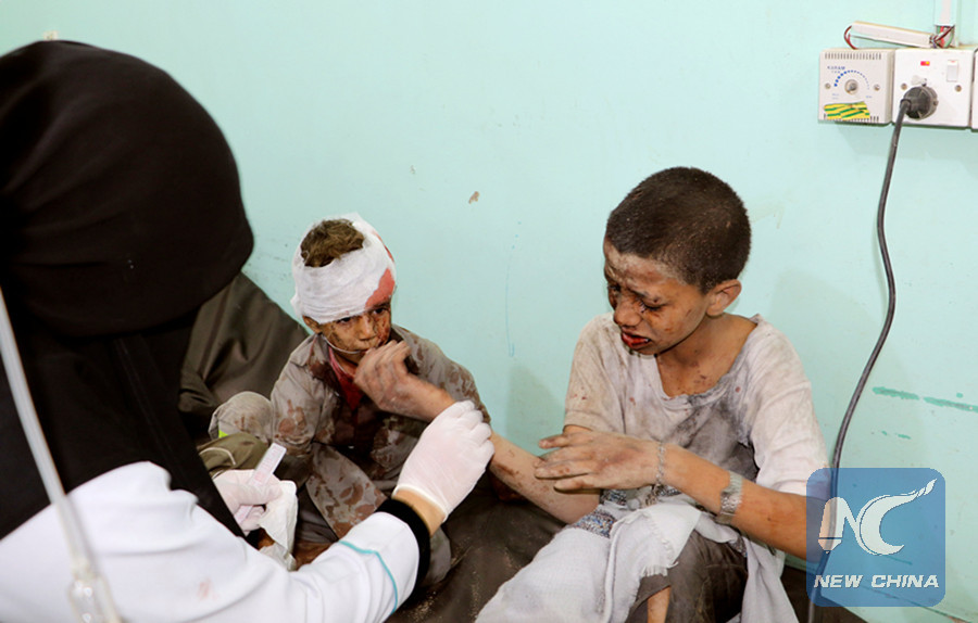 SANAA, Aug. 9 (Xinhua) -- At least 43 civilians, mostly children, were killed on Thursday when Saudi-led coalition air strikes hit buses in Yemen's northern province of Saada, the head of Saada Health Office Yahya Shayem told Xinhua.