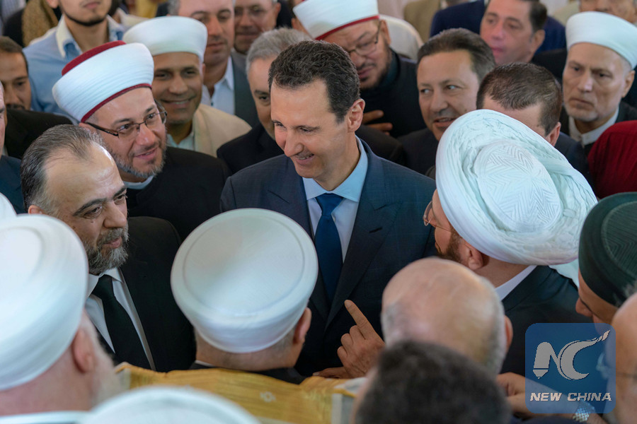 The Imam said after the prayer that "Mr. President, you have led the ship to the safety shore with wisdom and ability as you were the skillful shipmaster. The people are behind you hand in hand to build the glory of Syria."