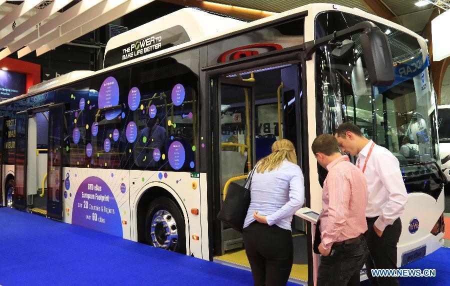 Photo taken on Oct. 19, 2017 shows a BYD electric bus during media preview days of the Busworld Europe in Kortrijk, Belgium. (Xinhua/Wang XiaoJun)