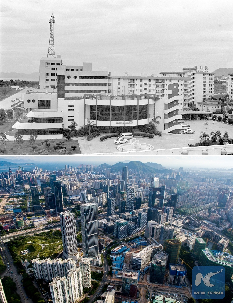 The upper part (file) of this combo photo shows Yumin Village in the 1980s in Shenzhen, south China's Guangdong Province. The lower part taken on March 26, 2018 shows a new look of the village. (Xinhua)