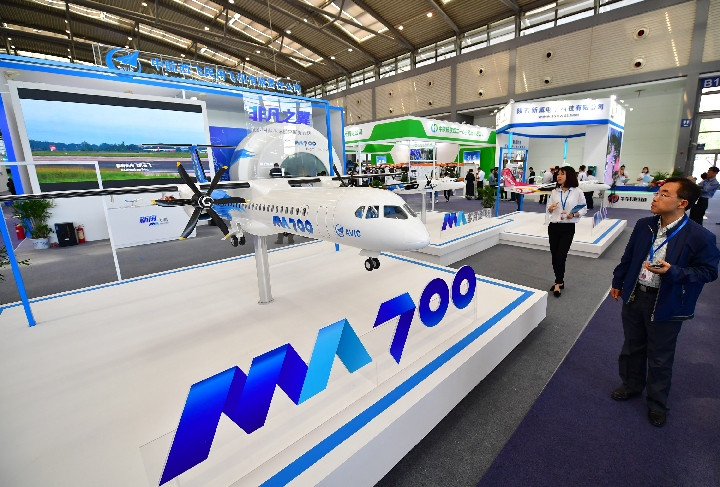 A MA700 aricraft model displayed at the 3rd Sild Road International Expo in Xi'an, northwest China's Shaanxi Province on May 11, 2018. (Xinhua/Shao Rui)
