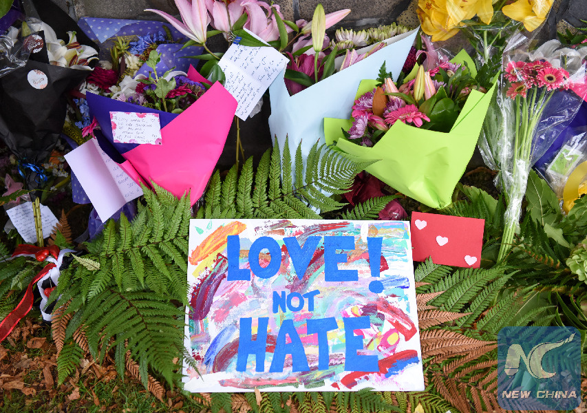 Photo taken on March 16, 2019 shows cards and flowers people placed to mourn the victims of the attacks on two mosques in Christchurch, New Zealand. (Xinhua/Guo Lei)