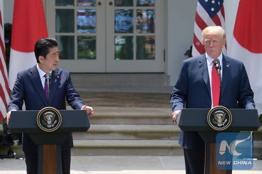 U.S. President Donald Trump (R) and Japanese Prime Minister Shinzo Abe attend a joint press briefing at the White House in Washington D.C., the United States, on June 7, 2018. (Xinhua/Yang Chenglin)