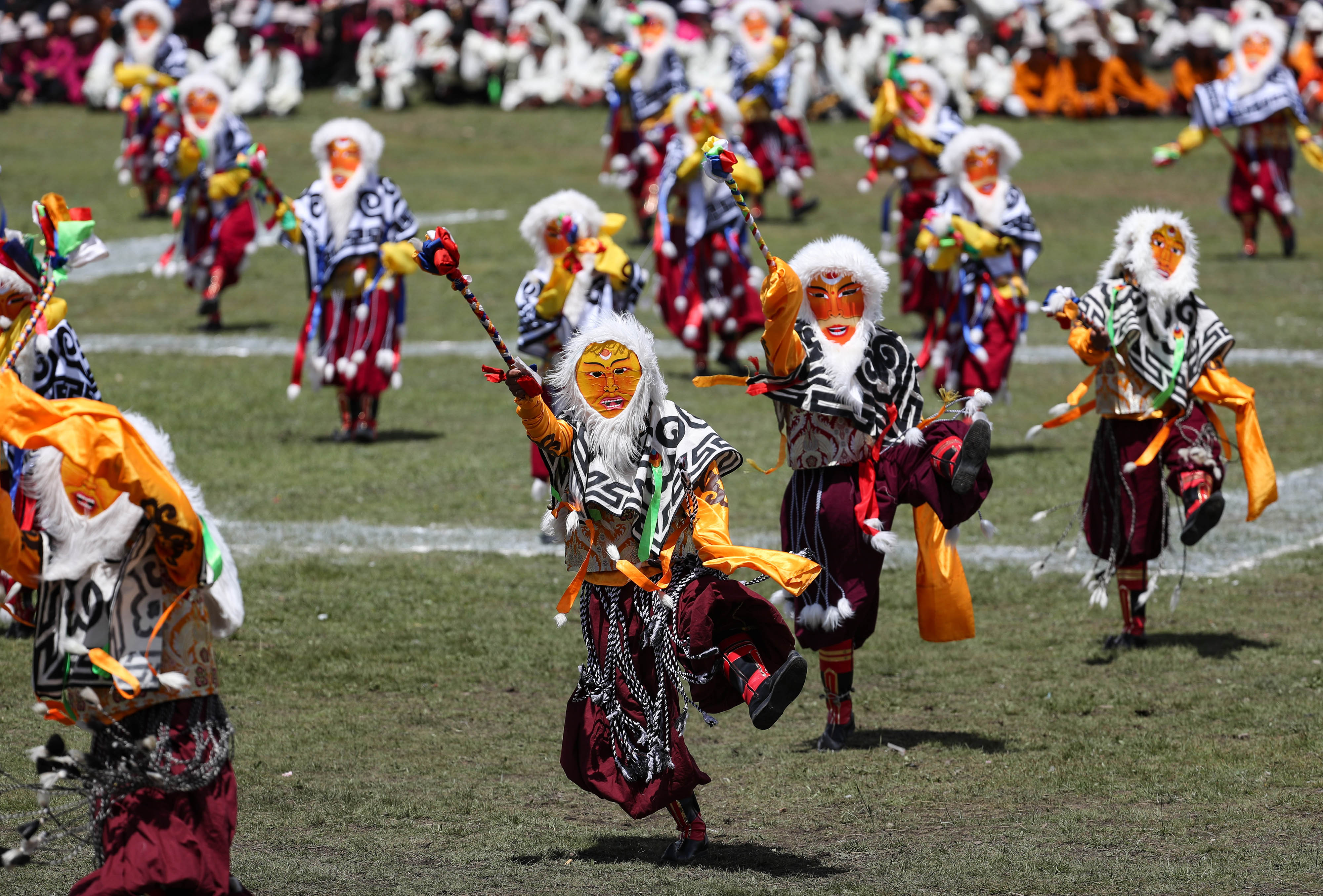 People perform Tibetan opera on the opening ceremony of a horse racing festival in Litang County, southwest China's Sichuan Province, July 30, 2019. (Xinhua/Jiang Hongjing)