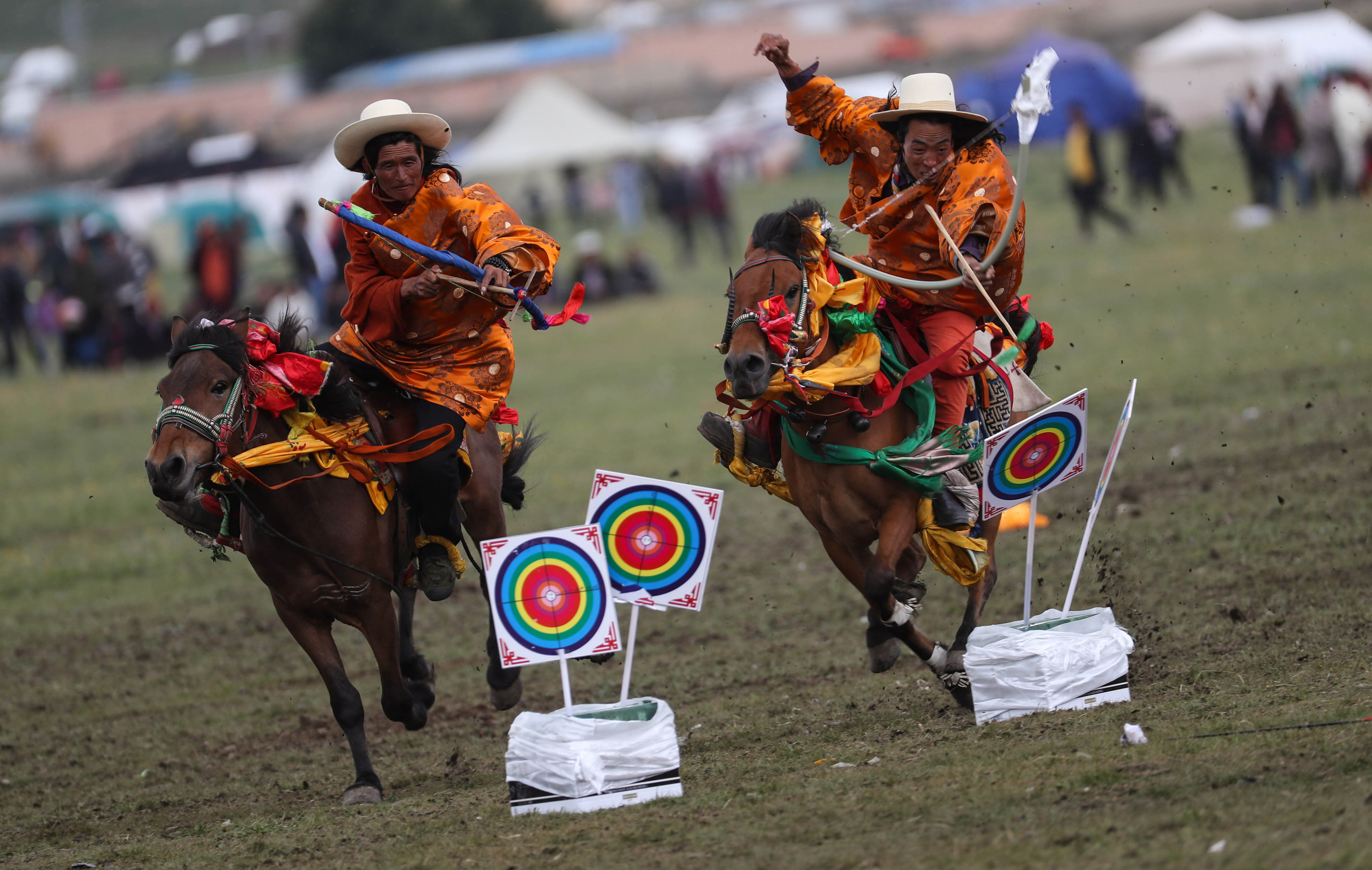 Riders perform horsemanship during a horse racing festival in Litang County, southwest China's Sichuan Province, July 30, 2019. (Xinhua/Jiang Hongjing)