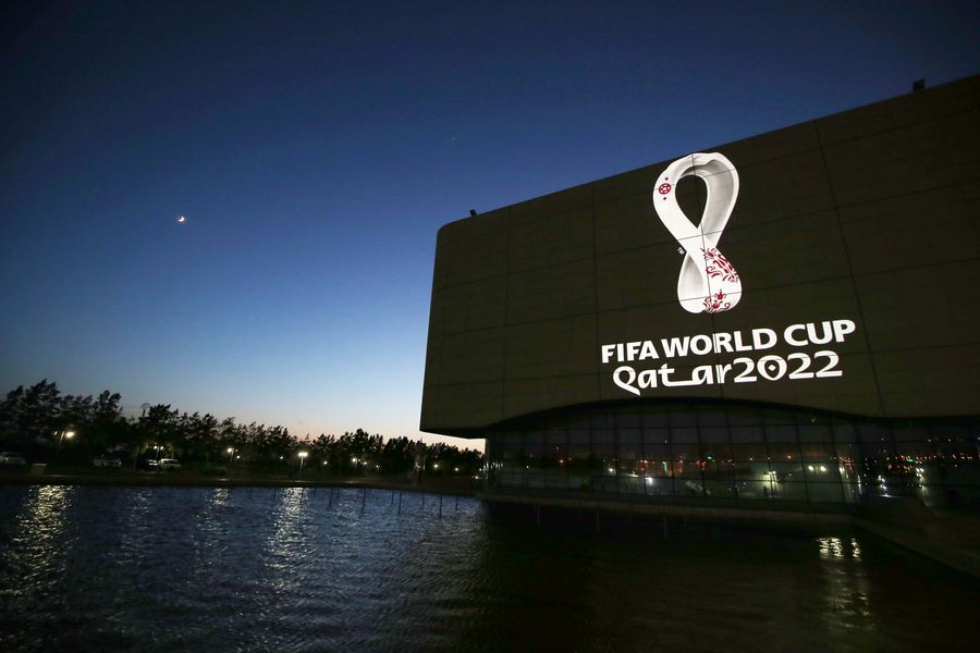 Image of the emblem of 22nd edition of the FIFA World Cup is shown on the building at Souq Waqif market in Doha, capital of Qatar, on Sept. 3, 2019. (Xinhua/Nikku)