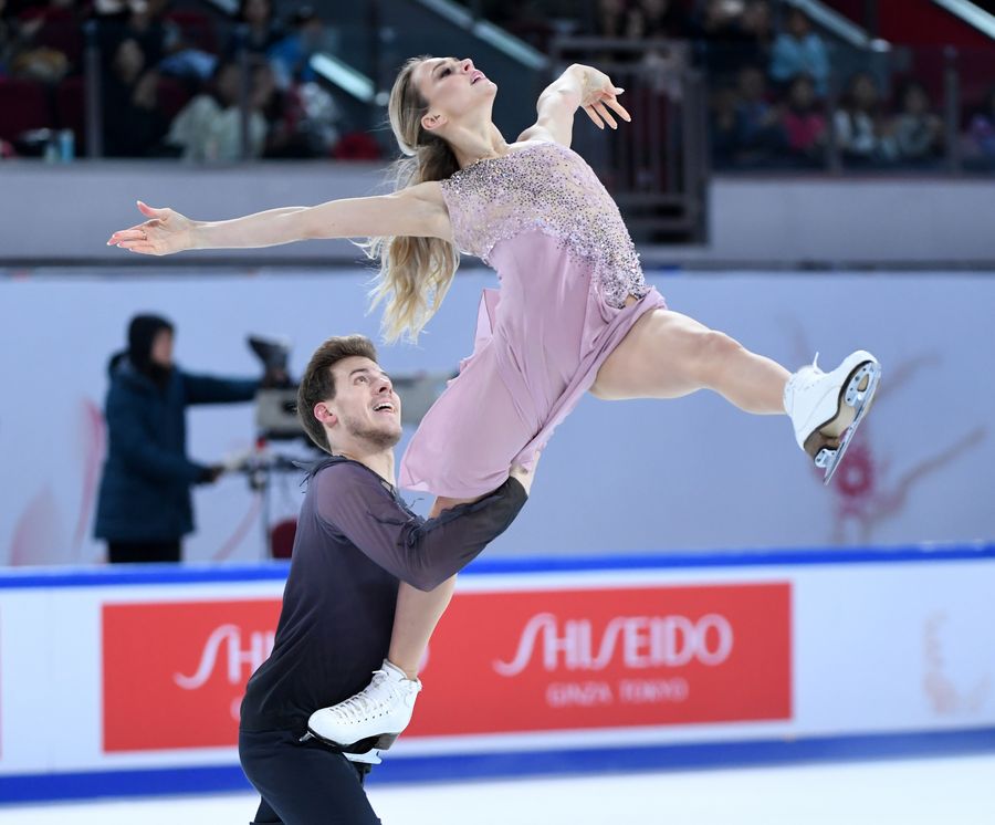 Madison Chock/Evan Bates (R) of the United States perform during the Ice Dance Free Dance at the ISU Grand Prix of Figure Skating Cup of China 2019 in Chongqing, southwest China, Nov. 9, 2019.