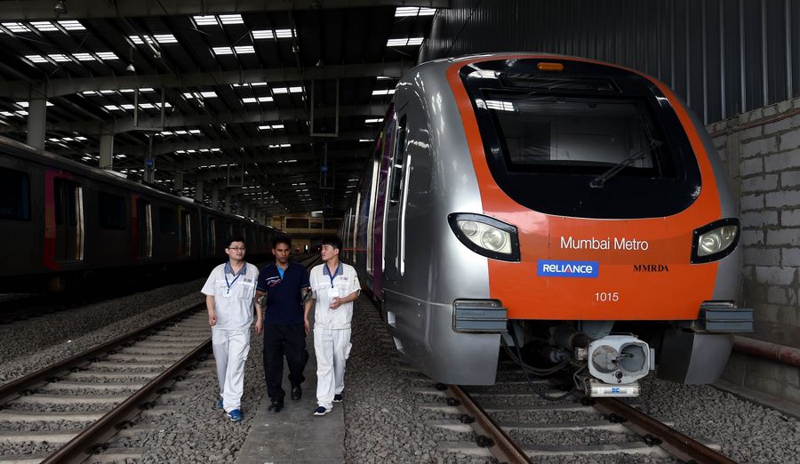 Chinese and Indian staff work at a metro car depot of Metro Line 1, in Mumbai, India, June 27, 2018. Mumbai Metro Line 1 became operational on June 8, 2014, with its trains produced by China's CRRC Nanjing Puzhen Co., Ltd. (Xinhua/Zhang Naijie)