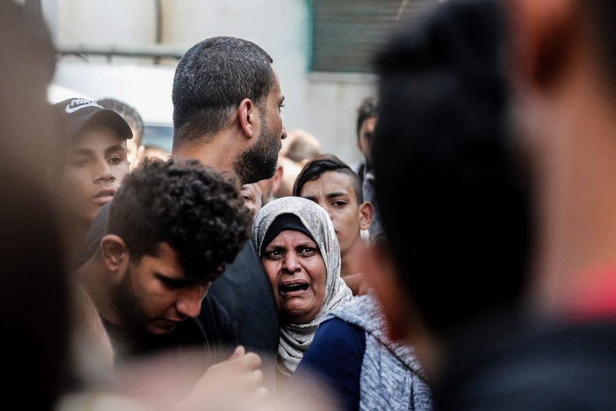 A Palestinian mourns her relatives who were killed in Israeli airstrikes at a hospital morgue in Gaza City, Nov. 13, 2019. (Xinhua/Rizek Abdeljawad)