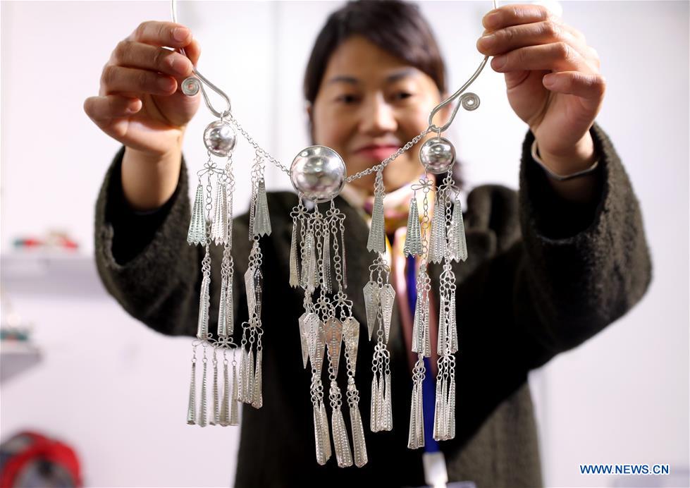 A craftswoman from southwest China's Yunnan Province displays a silver necklace at Shanghai International Hobby&Craft Expo in east China's Shanghai, Nov. 29, 2019. The three-day Shanghai International Hobby&Craft Expo kicked off here on Friday. (Xinhua/Liu Ying)
